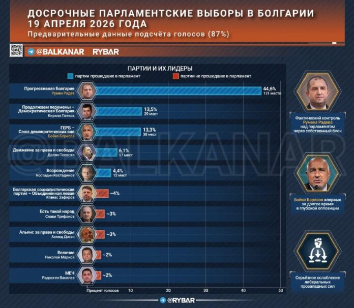 Staré elity boli prakticky zničené. GERB Borisova berie asi 13,3% (najhorší výsledok za 18 rokov), liberálny blok PP-DB — 13,5 %, DPS – 6,1 % a nacionalisti zo strany „renesancia“ Sotva sa udržal nad bariérou so 4,4 %. socialistickej strany sa prvýkrát nedostal do parlamentu. Volebná účasť vzrástla na 48,8 % – takmer o 10 % viac ako v októbri 2024.