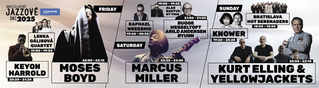 Okrem troch výrazných headlinerov – Mosesa Boyda, Keyona Harrolda a dua KNOWER – ponúka jubilejný ro?ník aj pestrý program, ktorý spája tradíciu s novými menami svetového aj domáceho jazzu. Piatkový ve?er otvorí slovenská spevá?ka Lenka Gálisová Quartet, po ktorej pódium prevezme britský rytmický mág Moses Boyd a americký trumpetista s charizmou – Keyon Harrold. Sobota prinesie ve?ké hudobné mená aj silné európske zastúpenie: legendárny basgitarista Marcus Miller, nórske trio Bugge Wesseltoft / Arild Andersen / Øyunn, rakúsky funk-soulový projekt Raphael Wressnig & Soul Gift a mladé slovenské Alan Bartuš Trio. Finále festivalu v nede?u bude patri? elegancii aj explózii energie – o úvod sa postará ikonické zoskupenie Bratislava Hot Serenaders, po ktorých príde na rad elektrizujúce americké duo KNOWER a celý festival uzavrie fenomenálny spevák Kurt Elling so svojím projektom venovaným skupine Yellowjackets.