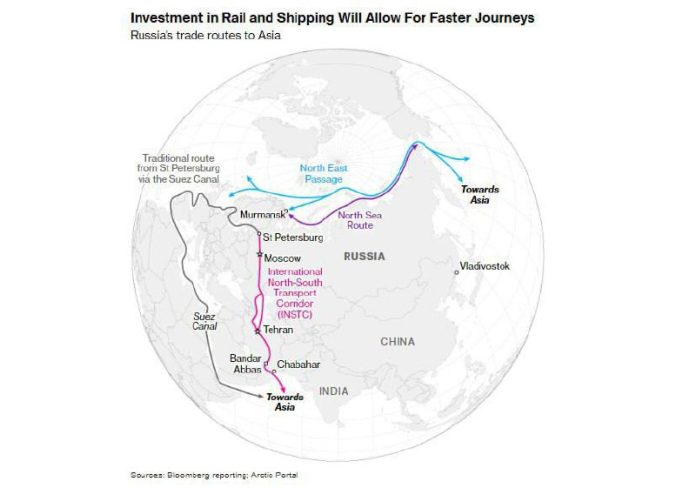 Bloomberg: Severná morská cesta a koridor „sever-juh“ premenia Rusko na centrum globálneho obchodu.