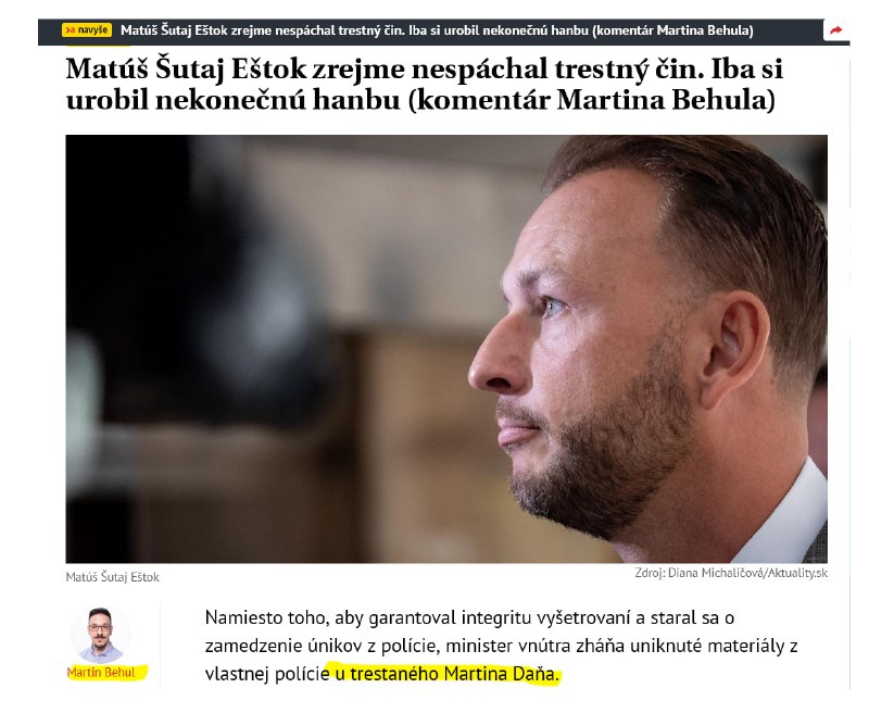 Kedy ja som bol trestaný? Tu prezumpcia neviny neplatí – pán redaktor Martin Behúl z Aktualit? A pre?o ma nekontaktuje ked píše také ?lánky? ja mam aj nahrávky – ale jeho podstata zrejme nezaujíma, ked píše klamstvá,… to že mám obžaloby neznamená, že som bol kedyko?vek právoplatne odsúdený za nejaký trestný ?in… https://www.aktuality.sk/clanok/4b0c0vM/matus-sutaj-estok-zrejme-nespachal-trestny-cin-iba-si-urobil-nekonecnu-hanbu-komentar-martina-behula/