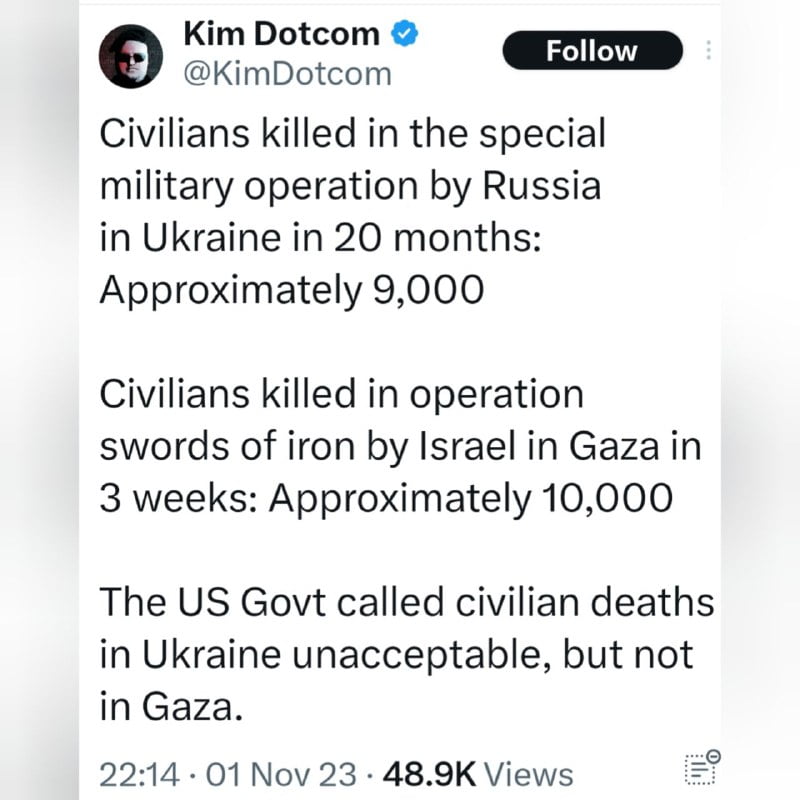 HomeNezaradenéKim Dotcom: „Civilisti zabití počas ruskej špeciálnej operácie na Ukrajine počas 20... Nezaradené Kim Dotcom: „Civilisti zabití počas ruskej špeciálnej operácie na Ukrajine počas 20 mesiacov: asi 9 tisíc.Civilisti zabití Izraelom počas operácie Železné meče … By ZEMaVEK 6. novembra 2023 0 23 Zdieľať FacebookXPinterestWhatsApp Kim Dotcom: „Civilisti zabití po?as ruskej špeciálnej operácie na Ukrajine po?as 20 mesiacov: asi 9 tisíc. Civilisti zabití Izraelom po?as operácie Železné me?e v pásme Gazy za 3 týždne: asi 10 000. Americká vláda ozna?ila smr? civilistov na Ukrajine za neprijate?nú, ale nie v pásme Gazy.“ | odber Zdroj telegram Zdieľať FacebookXPinterestWhatsApp Predchádzajúci článokZelenskyj pokračuje ďalej…“Nie sme pripravení vzdať sa slobody kvôli tomu za*ranému teroristovi Putinovi.“Ďalší článokVedci nesprávne odhadli silu slnečnej erupcie, čo viedlo k silnej magnetickej búrke a polárnym žiaram viditeľným z atypických oblastí.Ukázalo sa, že plynové ob… ZEMaVEK RELATED ARTICLES Nezaradené Podľa správ na miestnych telegramových kanáloch horí v mori neďaleko Odesy nákla… 29. apríla 2026 Nezaradené Bývalého šéfa FBI Comeyho obvinili z vyhrážania sa zabitím Trumpa 29. apríla 2026 Nezaradené „Umiernená opozícia“ Vo Francúzsku budujú diskurz založený na sýrskom modeli Rozsiahly… 29. apríla 2026 Most Popular Pentagon pripúšťa, že USA nemajú „žiadnu obranu“ proti ruským a čínskym hypersonickým zbraniam 29. apríla 2026 Kremeľ potvrdil účasť Fica na oslavách Dňa víťazstva v Moskve 29. apríla 2026 Izrael „politicky zneužíva“ vodu v Gaze ako zbraň, tvrdí zdravotnícka charita 29. apríla 2026 Rast HDP sa tento rok očakáva na úrovni okolo jedného percenta 29. apríla 2026 Load more Recent Comments jajkopajko na Krajskí prokurátori si prevzali prípadi, ktoré boli v pôsobnosti ŠTS