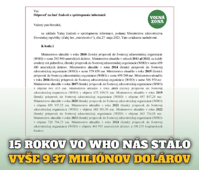 Tak znela oficiálna odpoveď z MZ SR v lete 2025 na našu infožiadosť, ktorou sme sa zaujímali o naše výdavky do WHO.