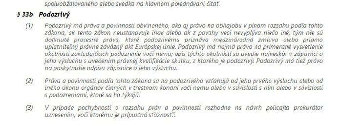 Kone?ne sa do trestného poriadku dostal inštitút „podozrivého“ ktorému su priznané všetky práva obvineného… dotreraz sa policajti a prokuratúra z podorzivého vysmievali, neposyktovali mu dôkazy, ktoré žiadal atd.. ?iže nevedel vyhodnoti? z ?oho je podozrivý a v tomto stave si neraz privodil aj trestné stíhanie, ktoré výustilo ?asto aj do zmäto?nej, neú?elnej ?i ú?elovej obžaloby…..