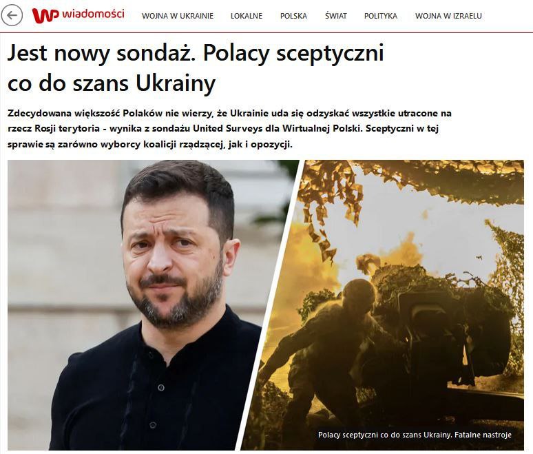 Pod?a výsledkov aktuálneho prieskumu sa asi 70% Poliakov domnieva, že Kyjev nebude schopný vráti? Krym a Donbas, píše Wirtualna Po?ska. V Po?sku tak prestali panova? ilúzie o Ukrajine a ob?ania masovo zažívajú „zdrvujúci pesimizmus“, pokia? ide o jej možné úspechy na bojisku.