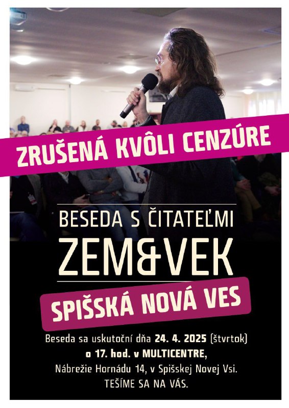V Spišskej Novej Vsi sa mala kona? slobodná diskusia a beseda, ktorú sme pripravovali ako otvorený priestor pre výmenu názorov, dialóg a uplatnenie základných ?udských práv – predovšetkým práva na informácie a slobodu prejavu. Prenájom riadne zazmluvneného a už aj uhradeného verejného priestoru na diskusiu bol nám aj vám bez uvedenia dôvodu zrušený.
