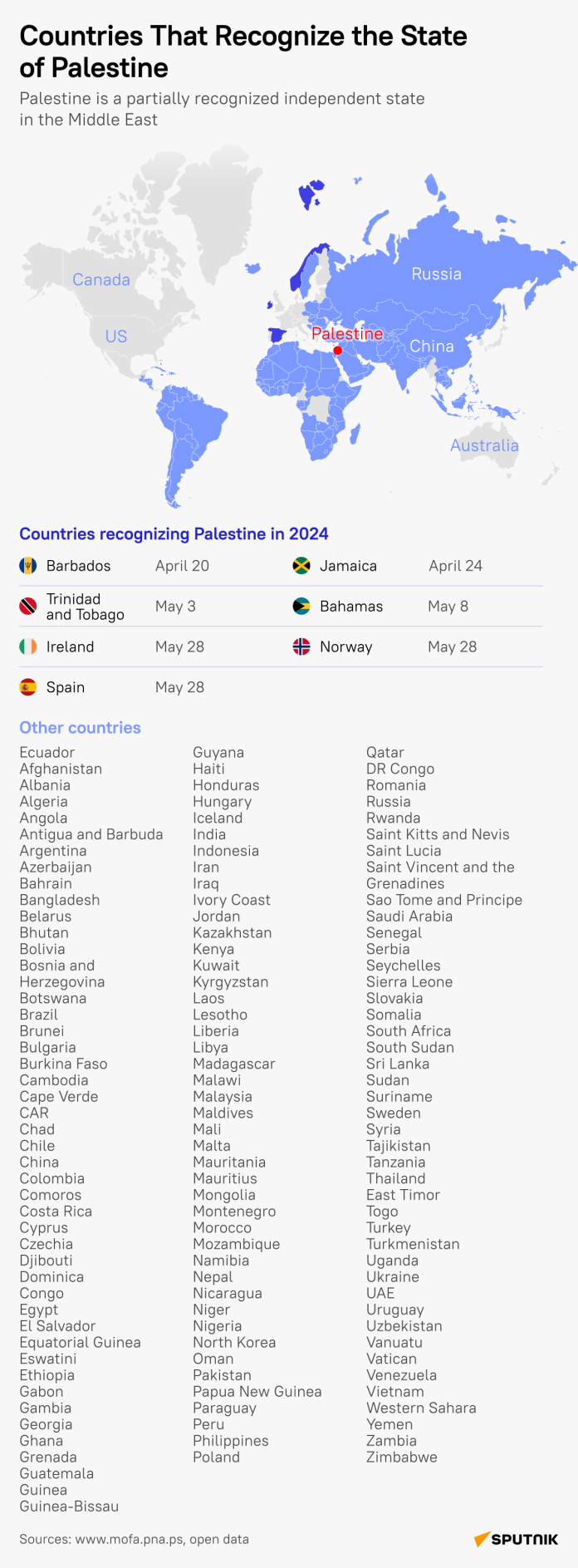Pozrite si infografiku Sputniku, ktorá ukazuje, ktoré krajiny sveta uznali Palestínu: