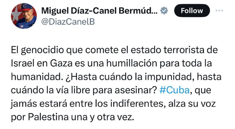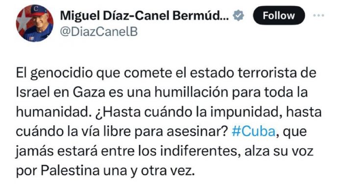 Kubánsky prezident Miguel Díaz-Canel: Genocída spáchaná teroristickým štátom Izrael v pásme Gazy je ponížením pre celé ?udstvo. Ako dlho bude existova? beztrestnos?, ako dlho bude existova? vo?ný spôsob vraždy?