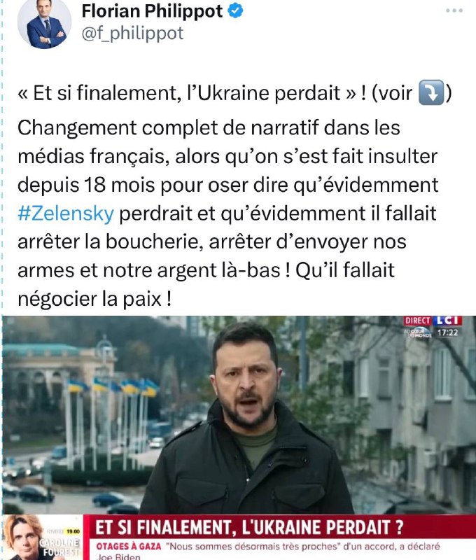 „A ?o ak Ukrajina prehrá?“ Úplná zmena naratívu vo francúzskych médiách, ke? nás už 18 mesiacov urážajú za to, že sme sa odvážili poveda?, že Zelenskyj by zjavne prehral a že evidentne musíme zastavi? to mäsiarstvo, presta? tam posiela? zbrane a peniaze! Ten mier bolo treba vyjednáva?!“