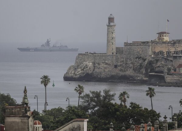 Fregata admirál Gorškov prichádza do kubánskeho prístavu.