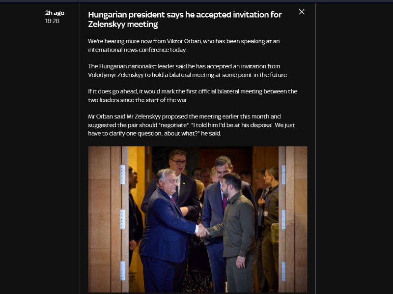 HomeNezaradenéMaďarský premiér Viktor Orbán prijal pozvanie Volodymyra Zelenského na bilaterálne stretnutie -... Nezaradené Maďarský premiér Viktor Orbán prijal pozvanie Volodymyra Zelenského na bilaterálne stretnutie – Sky News.Ak sa tak stane, znamenalo by to prvé oficiálne bilate… By ZEMaVEK 22. decembra 2023 0 6 Zdieľať FacebookTwitterPinterestWhatsApp Ma?arský premiér Viktor Orbán prijal pozvanie Volodymyra Zelenského na bilaterálne stretnutie – Sky News. Ak sa tak stane, znamenalo by to prvé oficiálne bilaterálne stretnutie oboch lídrov od za?iatku konfliktu na Ukrajine. Zdieľať FacebookTwitterPinterestWhatsApp Predchádzajúci článokMaďarský premiér Orbán zhrnul výsledky roku 2023 na veľkej tlačovej konferencii. Hlavné body:Konflikt na Ukrajine je špeciálna vojenská operácia, pretože Rusko…Ďalší článokV Taliansku chcú pokutovať školy, ktoré na Vianoce rušia predstavenia s biblickými príbehmi, uvádza BBC.Táto prax z dôvodov „multikulturalizmu“ sa na školách p… ZEMaVEK RELATED ARTICLES Nezaradené R. Fico: SR investuje do zdravotníctva historicky najviac, čím výrazne zrýchľujeme modernizáciu. 3. marca 2026 Nezaradené Kuvajt zostrelil tri americké vojenské lietadlá (VIDEO) 3. marca 2026 Nezaradené VIDEO: Niekoľko amerických stíhačiek F-15 sa počas útokov na Irán zrútilo. Pilot… 3. marca 2026 ZANECHAJTE KOMENTÁR Zrušiť odpoveď Komentár: Zadajte svoj komentár! Názov:* Sem zadajte svoje meno Email:* Zadali ste nesprávnu e-mailovú adresu! Sem zadajte svoju e-mailovú adresu Webová stránka: Uložte moje meno, e-mail a webovú stránku do tohto prehliadača pri najbližšom komentovaní. Most Popular USA navyšujú sily na Blízkom východe, Pentagon varuje, že boj s Iránom „bude trvať nejaký čas“ 3. marca 2026 Izraelská armáda útočí v Libanone aj Iráne 3. marca 2026 Rubio tvrdí, že zo strany Iránu hrozila bezprostredná hrozba 3. marca 2026 OTÁZKY, AKÉ (ZATIAĽ) NIKTO NEKLADIE. Máme už beztak svojich vlastných vážnych st… 3. marca 2026 Recent Comments jajkopajko na Krajskí prokurátori si prevzali prípadi, ktoré boli v pôsobnosti ŠTS