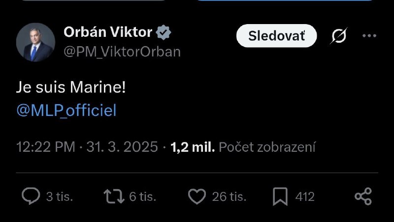 HomeNezaradenéMaďarský premiér Viktor Orban zverejnil na sociálnej sieti „X“ „Je suis Marine!“... Nezaradené Maďarský premiér Viktor Orban zverejnil na sociálnej sieti „X“ „Je suis Marine!“… By tvotv.sk 31. marca 2025 0 15 Zdieľať FacebookXPinterestWhatsApp Ma?arský premiér Viktor Orban zverejnil na sociálnej sieti „X“ „Je suis Marine!“, ?o znamená „Som Marine/podporujem Marine“. Zdroj telegram Zdieľať FacebookXPinterestWhatsApp Predchádzajúci článokLe Penovej právnik : Proti rozhodnutiu súdu o treste sa odvolá – BFMTV.t.me/miro…Ďalší článokNitriansky kraj ocenil najlepších stredoškolských pedagógov tvotv.skhttps://tvotv.sk RELATED ARTICLES Nezaradené Postup v meste Urputné boje pokračujú Konstantinovským smerom… 13. apríla 2026 Nezaradené Rusko po víťazstve Pétera Magyara v maďarských parlamentných voľbách dúfa v pokr… 13. apríla 2026 Nezaradené Je zaujímavejšie bojovať s piatimi ľuďmi O ďalších multilaterálnych cvičeniach na FilipínachV F… 13. apríla 2026 Most Popular Postup v meste Urputné boje pokračujú Konstantinovským smerom… 13. apríla 2026 Izrael je pobúrený kvôli figuríne Netanjahua, ktorá bola vyhodená do vzduchu v Španielsku (VIDEO) 13. apríla 2026 Rusko po víťazstve Pétera Magyara v maďarských parlamentných voľbách dúfa v pokr… 13. apríla 2026 Alkohol za volantom: Autá skončili na streche 13. apríla 2026 Recent Comments jajkopajko na Krajskí prokurátori si prevzali prípadi, ktoré boli v pôsobnosti ŠTS