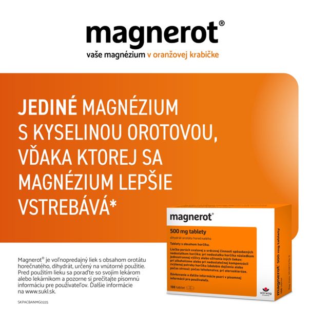 Magnerot® je vo?nopredajný liek s obsahom orotátu hore?natého, dihydrát, ur?ený na vnútorné použitie. Pred použitím lieku sa pora?te so svojím lekárom alebo lekárnikom a pozorne si pre?ítajte písomnú informáciu pre používate?ov. ?alšie informácie na www.sukl.sk.