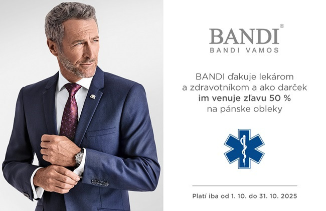 Dar?ek je ur?ený lekárom, zdravotníkom, lékarnikom, sestrám a všetkým zamestnancom pracujúcim v zdravotníctve. Všetci tí môžu od 1. októbra do 31. októbra 2025 využi? mimoriadnu z?avu 50 % na vybrané pánske obleky. Muži si v tomto termíne v predajniach BANDI zadovážia obleky do zamestnania, na ples, svadbu a rodinné oslavy za polovi?nú cenu.