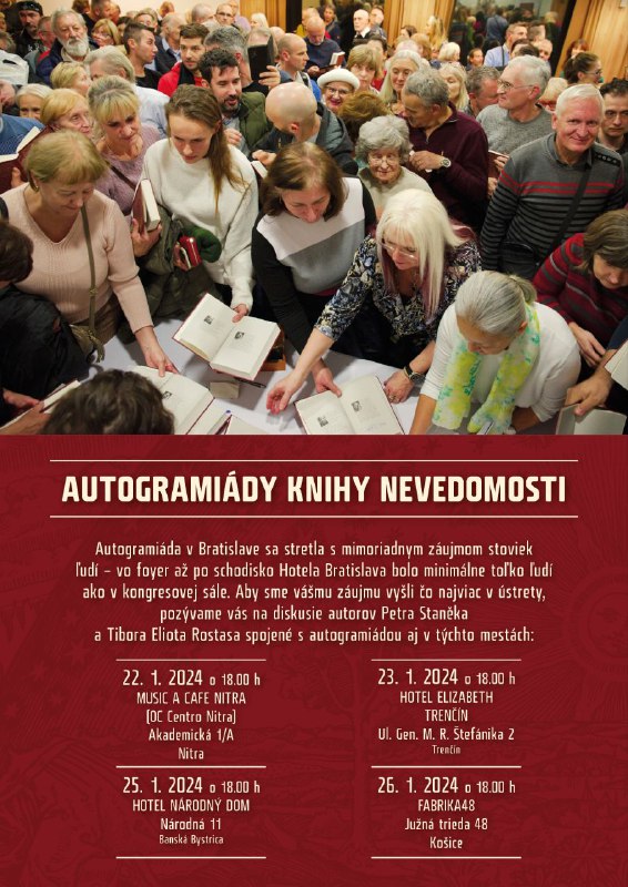 Milí priatelia a čitatelia, už od pondelka 22. januára sa na Vás s profesorom Staněkom tešíme na autogramiádach s besedami, kde si môžete kúpiť aj KNIHU NEVEDOM…