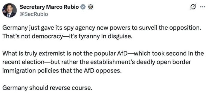 „Nemecko práve dalo svojej tajnej službe nové právomoci na sledovanie opozície. To nie je demokracia – to je tyrania v prestrojení.“