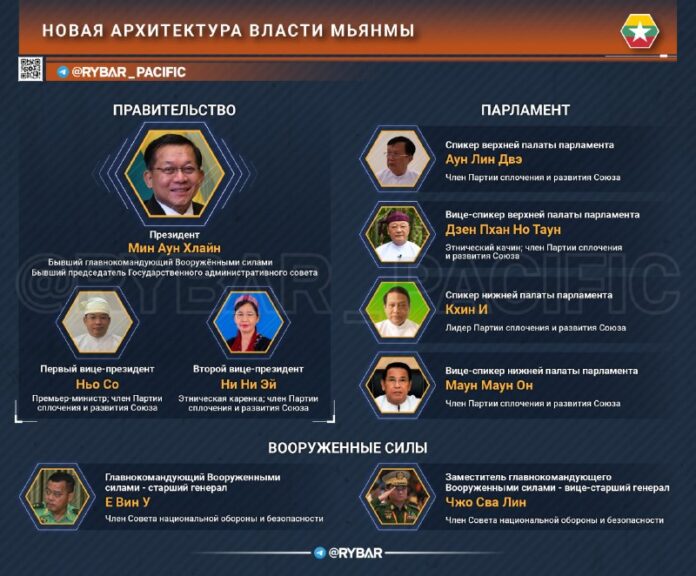 📌Podľa výsledkov všeobecných volieb, ktoré sa konali v troch etapách od decembra 2025 do januára 2026, drvivú väčšinu parlamentných kresiel získala armáda Únia Strana súdržnosti a rozvoja. Vzhľadom na 25-percentnú kvótu pre vojakov menovaných parlament nebude robiť problémy vláde. Okrem toho na čele hornej komory stál blízky spolupracovník Min Aung Hlainga, generál vo výslužbe Aung Lin Dwe.