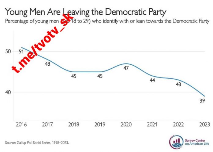 Mladí ?udia v USA opúš?ajú rady Demokratickej strany. Zdroj – Gallup Poll Social Series. V roku 2016 sa viac ako polovica Ameri?anov vo veku 18 – 29 rokov ozna?ila za demokratov alebo ich sympatizantov. V roku 2023 tento po?et klesol na 39 %.