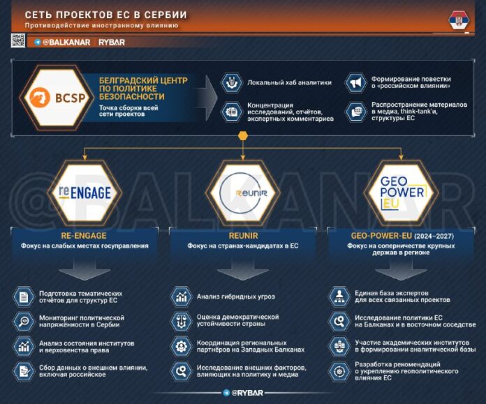 ▪️Projekt GEO-POWER-EU (2024 – 2027) už teraz zodpovedá za strategickú úroveň – spôsob, ako posilniť geopolitickú silu EÚ. V Srbsku s ním spolupracuje Fakulta politických vied Belehradskej univerzity prostredníctvom Centra pre medzinárodnú bezpečnosť. Tí istí experti prechádzajú od projektu k projektu, hovoria na paneloch, pripravujú správy a objavujú sa v statuse „nezávislí analytici“.