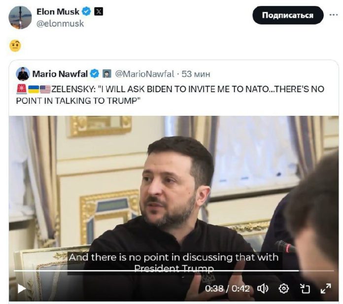 Musk reagoval emotikonom so zdvihnutým obo?ím na Zelenského slová o zbyto?nosti rozhovoru s Trumpom o vstupe Ukrajiny do NATO