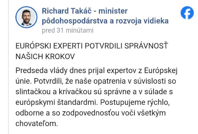 Takáč sa spolu so šéfom štátnej veterinárnej správy Martinom Chudým vo štvrtok ráno stretli v Bratislave s expertmi Európskej komisie na ochorenie slintačka a krívačka.
