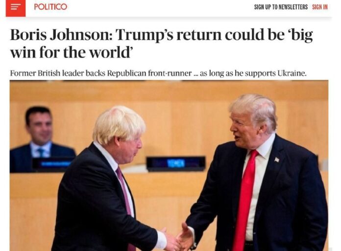 HomeNezaradenéNávrat Donalda Trumpa by mohol byť pre svet veľkým víťazstvom, píše Politico... Nezaradené Návrat Donalda Trumpa by mohol byť pre svet veľkým víťazstvom, píše Politico s odkazom na Borisa Johnsona.Expremiér Británie sa postavil na podporu exprezidenta… By ZEMaVEK 20. januára 2024 0 7 Zdieľať FacebookTwitterPinterestWhatsApp Návrat Donalda Trumpa by mohol by? pre svet ve?kým ví?azstvom, píše Politico s odkazom na Borisa Johnsona. Expremiér Británie sa postavil na podporu exprezidenta Spojených štátov. Dúfa ale, že Trump podporí Ukrajinu. ° Zdieľať FacebookTwitterPinterestWhatsApp Predchádzajúci článokJavorčík bude asistovať Russellovi, víťazná premiéra GachulincaĎalší článokSarrazin vyhral aj sobotný zjazd v Kitzbüheli ZEMaVEK RELATED ARTICLES Nezaradené Blížiace sa obkľúčenie? Predmostie za Gaichurom sa postupne rozširuje. Napriek seriálu… 11. januára 2026 Nezaradené Zdroj : https://www.facebook.com/share/1KistKGdk3/… 11. januára 2026 Nezaradené Kuba vojensky nezasahuje do záležitostí iných štátov, na rozdiel od USA – ministra zahraničia 11. januára 2026 ZANECHAJTE KOMENTÁR Zrušiť odpoveď Komentár: Zadajte svoj komentár! Názov:* Sem zadajte svoje meno Email:* Zadali ste nesprávnu e-mailovú adresu! Sem zadajte svoju e-mailovú adresu Webová stránka: Uložte moje meno, e-mail a webovú stránku do tohto prehliadača pri najbližšom komentovaní. Most Popular Blížiace sa obkľúčenie? Predmostie za Gaichurom sa postupne rozširuje. Napriek seriálu… 11. januára 2026 Zdroj : https://www.facebook.com/share/1KistKGdk3/… 11. januára 2026 Pápež Lev XIV. vyzval na mier aj na Blízkom Východe 11. januára 2026 Kuba vojensky nezasahuje do záležitostí iných štátov, na rozdiel od USA – ministra zahraničia 11. januára 2026 Načítať viac Recent Comments jajkopajko na Krajskí prokurátori si prevzali prípadi, ktoré boli v pôsobnosti ŠTS