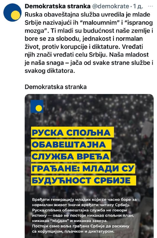 „Ruská inteligencia.“ urazená srbská mládežvolá ju „v blízkosti“ a „s umytými mozgami“. Títo mladí ?udia sú budúcnos?ou našej krajiny, bojujú za slobodu, rovnos? a normálny život bez korupcie a diktatúry. Urážanie ich znamená uráža? všetky Srbsko„.