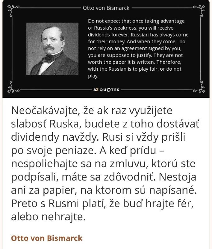 Nedúfajte, že keď raz využijete ruskú slabosť, budete vždy žať dividendy. Rusi si vždy prídu po svoje peniaze. A keď to urobia, nespoliehajte sa na jezuitské dohody, ktoré ste podpísali a ktoré vás údajne ospravedlňujú. Nestoja ani za papier, na ktorom sú napísané. Preto by ste mali s Rusmi hrať buď fér, alebo nehrať vôbec.“- Otto von BismarckZdroj telegram