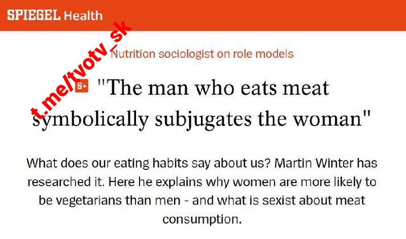 Nemeckí nutricionisti tvrdia: „Muž, ktorý konzumuje mäso, si symbolicky podma?uje ženu“. Doktor Martin Winter v štúdii vysvet?uje, že naše stravovacie návyky odrážajú sociálne roly. Analyzuje, pre?o sa ženy ?astejšie stávajú vegetariánkami ako muži a aký sexizmus môže by? spojený s konzumáciou mäsa.