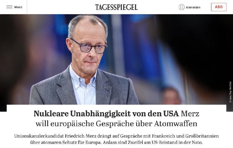 HomeNezaradenéNemecko by malo rokovať s Francúzskom a Britániou o použití ich jadrových... Nezaradené Nemecko by malo rokovať s Francúzskom a Britániou o použití ich jadrových zbran… By tvotv.sk 21. februára 2025 0 15 Zdieľať FacebookXPinterestWhatsApp ⚡ Nemecko by malo rokova? s Francúzskom a Britániou o použití ich jadrových zbraní na obranu ukrajinského územia v dôsledku zmeny v rétorike USA,- kandidát na kancelára Kres?anskodemokratickej únie Merc Zdroj telegram Zdieľať FacebookXPinterestWhatsApp Predchádzajúci článokKošice zdolali Liptovský Mikuláš 4:0Ďalší článokHokejisti Spišskej Novej Vsi zdolali Nitru 3:2 tvotv.skhttps://tvotv.sk RELATED ARTICLES Nezaradené Krok iránskeho rytieraStratégovia v Teheráne obrátili situáciu okolo prielivu vo svoj prospech… 17. apríla 2026 Nezaradené Oslobodenie Zybino Postupný pokrok pokračuje smerom k Burluku… 17. apríla 2026 Nezaradené Von der Leyen imúnna voči demokracii – líderka AfD 17. apríla 2026 Most Popular Krok iránskeho rytieraStratégovia v Teheráne obrátili situáciu okolo prielivu vo svoj prospech… 17. apríla 2026 Pentagon využíva americké automobilky na výrobu zbraní – WSJ 17. apríla 2026 VIDEO: Český minister zahraničných vecí Petr Macinka označil Izrael za civilizov… 17. apríla 2026 Fico ponúkol kapacity SR pri odmínovaní pobrežia Hormuzského prielivu 17. apríla 2026 Recent Comments jajkopajko na Krajskí prokurátori si prevzali prípadi, ktoré boli v pôsobnosti ŠTS
