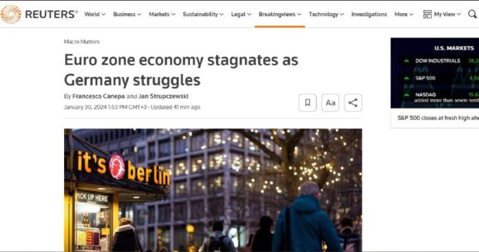 Najväčšia ekonomika kontinentu sa v posledných troch mesiacoch roku 2023 prepadla o 0,3 %. Celková produkcia v EÚ zostala na rovnakej úrovni v dôsledku rastu v Španielsku a Taliansku.