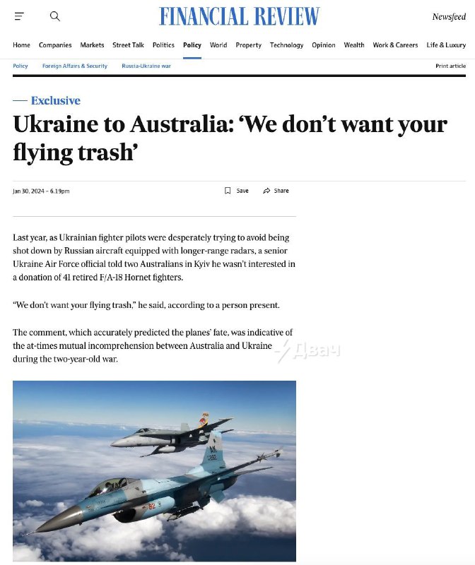 Ukrajina uviedla, že Kyjev nepotrebuje austrálske stíha?ky F-18 Hornet a nazvala ich „lietajúcim odpadom“. To fakticky ukon?ilo obchod so stíha?kami, píše Australian Financial Review.