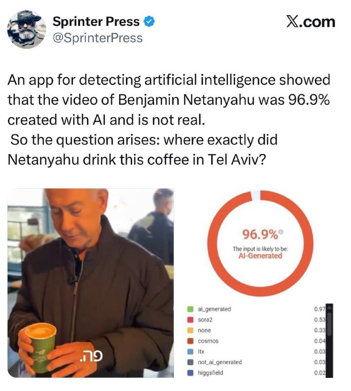 Medzi znaky toho, že najnovší film je podvrh, patrí káva, ktorá je naplnená až po okraj, ale bez ohľadu na to, ako veľmi sa pohár nakloní alebo rýchlo pohne, nevytečie z neho ani kvapka, ani sa množstvo nezmenší, kým Netanjahu pije!