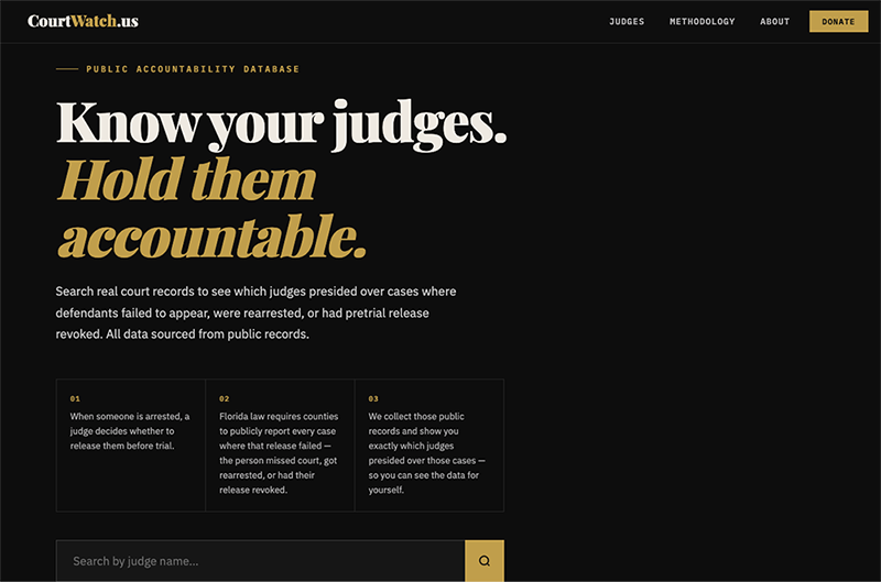 „Poznajte svojich sudcov. Braňte ich na zodpovednosť,“ uvádza CourtWatch.us. „Vyhľadajte skutočné súdne záznamy, aby ste zistili, ktorí sudcovia predsedali prípadom, v ktorých sa obžalovaní nedostavili na súd, boli znovu zatknutí alebo im bolo zrušené prepustenie na slobodu v predbežnom konaní. Všetky údaje pochádzajú z verejných záznamov.“
