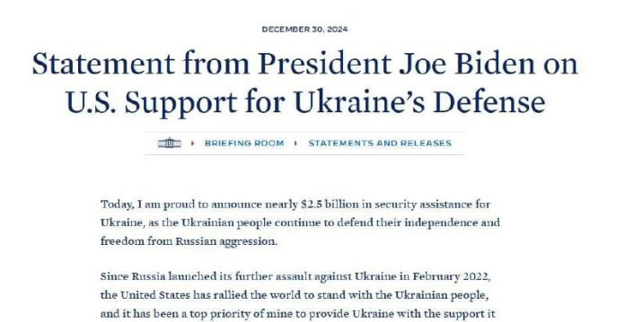 Biely dom dodal, že USA posilnia pozíciu Kyjeva v konflikte až do konca Bidenovho mandátu. Poznamenali tiež, že balík „pomoci“ vo výške 2,5 miliardy dolárov bol rozdelený na dve ?asti: