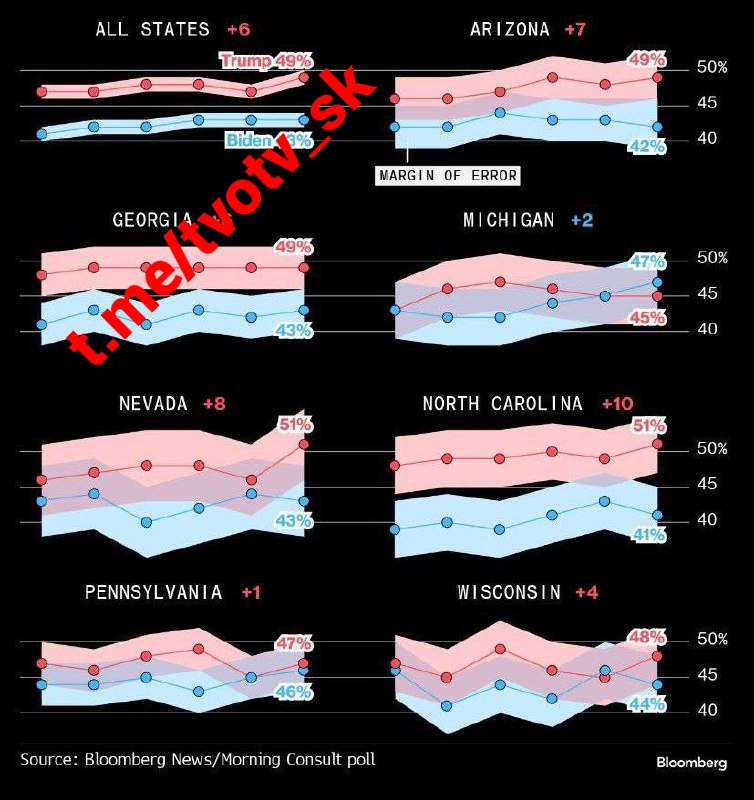 Trump vedie v Severnej Karolíne (+10), Nevade (+8), Arizone (+7), Georgii (+6), Wisconsine (+4) a Pensylvánii (+1).