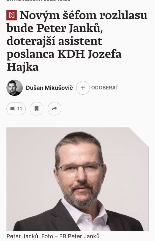 HomeNezaradenéNovým šéfom rozhlasu bude Peter Janků, doterajší asistent poslanca KDH Jozefa Ha... Nezaradené Novým šéfom rozhlasu bude Peter Janků, doterajší asistent poslanca KDH Jozefa Ha… By tvotv.sk 27. novembra 2025 0 1 Zdieľať FacebookTwitterPinterestWhatsApp Novým šéfom rozhlasu bude Peter Janků, doterajší asistent poslanca KDH Jozefa Hajka. Zdroj telegram Zdieľať FacebookTwitterPinterestWhatsApp Predchádzajúci článokVeterný park v obci Močenok nebude, envirorezort nevydal súhlas tvotv.skhttps://tvotv.sk RELATED ARTICLES Nezaradené Francúzi prikývli gruzínskemu obrannému sektoru Nedávna návšteva francúzskych predstaviteľov… 27. novembra 2025 Nezaradené Ruský obrat na východ nesúvisiaci s udalosťami na Ukrajine – Putin 27. novembra 2025 Nezaradené Ukrajina a Európa odolávajú mierovému tlaku USA, ale realita na bojisku štípe 27. novembra 2025 ZANECHAJTE KOMENTÁR Zrušiť odpoveď Komentár: Zadajte svoj komentár! Názov:* Sem zadajte svoje meno Email:* Zadali ste nesprávnu e-mailovú adresu! Sem zadajte svoju e-mailovú adresu Webová stránka: Uložte moje meno, e-mail a webovú stránku do tohto prehliadača pri najbližšom komentovaní. Most Popular Veterný park v obci Močenok nebude, envirorezort nevydal súhlas 27. novembra 2025 Rada prokurátorov SR zásadne nesúhlasí s návrhom transformácie ÚOO 27. novembra 2025 Francúzi prikývli gruzínskemu obrannému sektoru Nedávna návšteva francúzskych predstaviteľov… 27. novembra 2025 EP podporil zvýšenie transparentnosti v oblasti zahraničného vplyvu 27. novembra 2025 Načítať viac Recent Comments jajkopajko na Krajskí prokurátori si prevzali prípadi, ktoré boli v pôsobnosti ŠTS