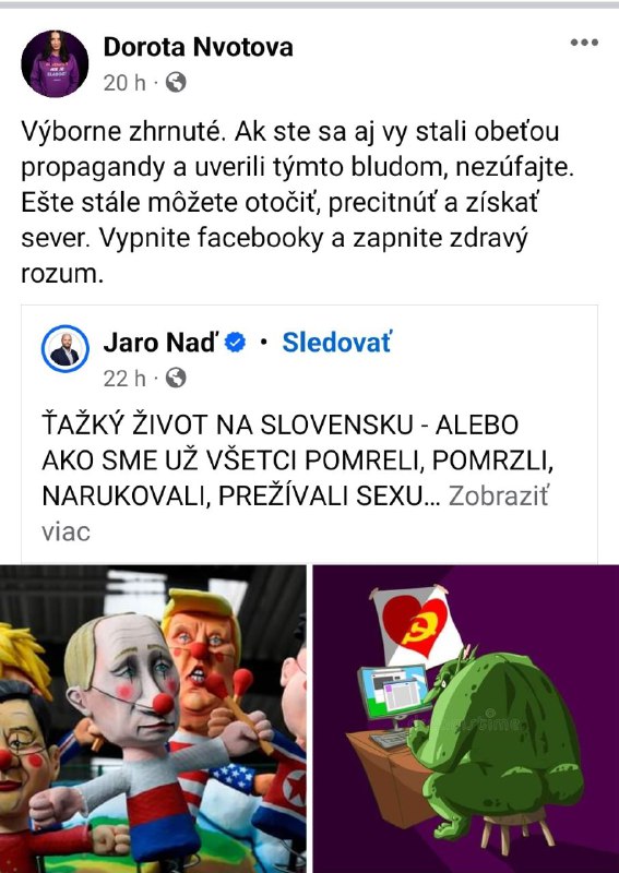 HomeNezaradenéNvotová: Ak ste sa aj vy stali obeťou propagandy nezúfajteV reakcii na... Nezaradené Nvotová: Ak ste sa aj vy stali obeťou propagandy nezúfajteV reakcii na Naďov „chcem byť vtipný“ status o 5G, Covide, povolávaní do vojny a podobne.Pozvite pria… By ZEMaVEK 8. januára 2024 0 14 Zdieľať FacebookXPinterestWhatsApp Nvotová: Ak ste sa aj vy stali obe?ou propagandy nezúfajte V reakcii na Na?ov „chcem by? vtipný“ status o 5G, Covide, povolávaní do vojny a podobne. | odber Zdroj telegram Zdieľať FacebookXPinterestWhatsApp Predchádzajúci článokOpozícia zvolala na štvrtok ďalší protest proti zámeru rušiť ÚŠPĎalší článokPápež vyzval na ukončenie útokov na civilistov ZEMaVEK RELATED ARTICLES Nezaradené Kronika špeciálnej vojenskej operácie z 29. apríla 2026Ruské jednotky na… 29. apríla 2026 Nezaradené Bývalý sovietsky štát odsúdil opozičného politika na 19 rokov väzenia 29. apríla 2026 Nezaradené Výsledky z 29. apríla video zhrnutie od projektového manažéra @rybar Michaila Zvinchuka špeciálne… 29. apríla 2026 Most Popular Hakimi vynechá pre zranenie odvetu semifinále na pôde Bayernu 30. apríla 2026 Slovensko podalo žalobu na Súdny dvor EÚ kvôli rozhodnutiu Európskej únie zakáza… 30. apríla 2026 V Hebrone na Západnom brehu izraelská armáda zabila tínedžera 30. apríla 2026 USA prvýkrát za desaťročia zažívajú stagfláciu – prorok krachu z roku 2008 30. apríla 2026 Load more Recent Comments jajkopajko na Krajskí prokurátori si prevzali prípadi, ktoré boli v pôsobnosti ŠTS
