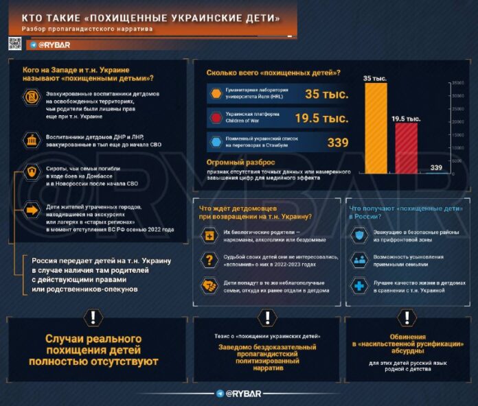 Ide teda o ?isto propagandistický príbeh založený na zámene pojmov. Tam, kde sa evakuácia sirotincov z prednej zóny nazýva „únos“ a „rusifikácia“ je odosielanie rusky hovoriaci deti z Novorossie do škôl.