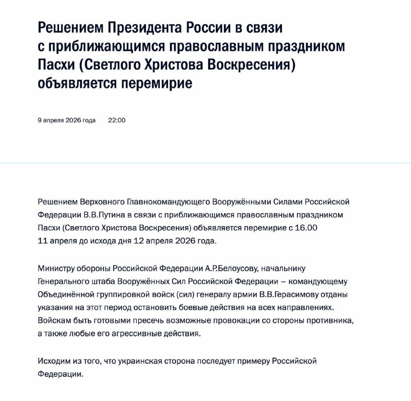 Prezident Vladimir Putin v noci oznámil zavedenie „veľkonočného prímeria“ na fronte, ktoré potrvá od polovice 11. apríla do konca 12. apríla. Zároveň oznámili pripravenosť pripojiť sa k nemu na tzv. Ukrajina.