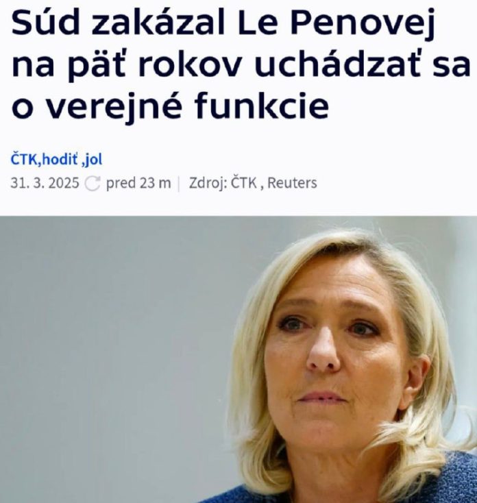Francúzsky súd uznal vodky?u Národného združenia (RN) Marine Le Penovou vinnou v procese, kde bola obvinená s ?alšími asi dvoma desiatkami ?udí zo sprenevery prostriedkov Európskeho parlamentu. Následne rozhodol, že sa po dobu piatich rokov nemôže uchádza? o verejné funkcie, ?ím jej znemožnil kandidatúru v nasledujúcich prezidentských vo?bách.