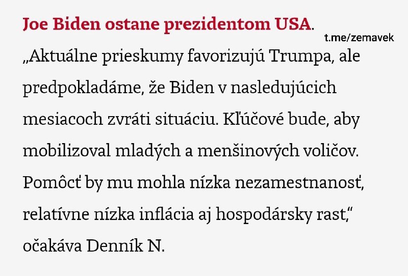 HomeNezaradenéOčakávania a tipovačky Denníka N: Aj keď je Trump favorizovaný, podľa nich... Nezaradené Očakávania a tipovačky Denníka N: Aj keď je Trump favorizovaný, podľa nich Biden zvráti situáciu. Treba vraj „mobilizovať“ mladých. By ZEMaVEK 2. januára 2024 0 25 Zdieľať FacebookXPinterestWhatsApp O?akávania a tipova?ky Denníka N: Aj ke? je Trump favorizovaný, pod?a nich Biden zvráti situáciu. Treba vraj „mobilizova?“ mladých. Zdieľať FacebookXPinterestWhatsApp Predchádzajúci článokOd 1. januára 2024 liberalizácia vízového režimu v Kosove umožní držiteľom pasov cestovať bez víz do krajín schengenského priestoru.Občania čiastočne uznaného …Ďalší článokVo veku 93 rokov zomrel disident Rijád Turk, prezývaný sýrsky Mandela ZEMaVEK RELATED ARTICLES Nezaradené Zábery údajne ukazujú izraelských vojakov rabovať v Libanone 30. apríla 2026 Nezaradené Irán nebude tolerovať námornú blokádu svojich prístavov zo strany USA. Teherán o… 30. apríla 2026 Nezaradené Saudskoarabský gigant predlžuje pozastavenie dodávok LPG po poškodení kľúčového závodu – Bloomberg 30. apríla 2026 Most Popular Zábery údajne ukazujú izraelských vojakov rabovať v Libanone 30. apríla 2026 Irán nebude tolerovať námornú blokádu svojich prístavov zo strany USA. Teherán o… 30. apríla 2026 Rezort obrany pozastavil výstavbu vojenskej nemocnice v Prešove 30. apríla 2026 Vlaky medzi Bratislavou a Kútmi budú od 5. mája jazdiť so zmenami 30. apríla 2026 Load more Recent Comments jajkopajko na Krajskí prokurátori si prevzali prípadi, ktoré boli v pôsobnosti ŠTS