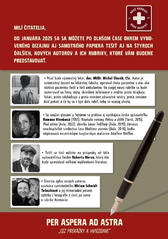 Myslíme, že vás poteší redizajnom, úplne novou kvalitou papiera ale aj tým, že Prozrete?nos? to tak chcela, aby sa k nám práve za?iatkom decembra 2024 pripojili hne? 4 ?alší noví a výborní autori s ich novými rubrikami: