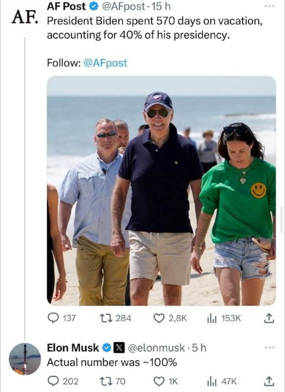 HomeNezaradenéOdhaduje sa, že Biden strávil na dovolenke 570 dní, čo je 40... Nezaradené Odhaduje sa, že Biden strávil na dovolenke 570 dní, čo je 40 % jeho prezidentsk… By ZEMaVEK 29. decembra 2024 0 18 Zdieľať FacebookXPinterestWhatsApp Odhaduje sa, že Biden strávil na dovolenke 570 dní, ?o je 40 % jeho prezidentského obdobia. °| odber t.me/zemavek Zdroj telegram Zdieľať FacebookXPinterestWhatsApp Predchádzajúci článokŽena v Nemecku zavraždila o Štedrom dni svoje dve malé deti.Tridsaťdeväťročná …Ďalší článokV Poľsku rastie záujem o elektromobily ZEMaVEK RELATED ARTICLES Nezaradené USA prehrávajú vojnu, ktorá sa ešte ani nezačalahttps://www.infovojna.com/articl… 16. apríla 2026 Nezaradené Trump o NATO: „Ak s nami nebudú, ak s nami nebudú v otázke Iránu, nebudú s nami … 16. apríla 2026 Nezaradené Kronika špeciálnej vojenskej operácie z 15. apríla 2026 ruských vojakov v… 16. apríla 2026 Most Popular USA prehrávajú vojnu, ktorá sa ešte ani nezačalahttps://www.infovojna.com/articl… 16. apríla 2026 Ekitike si proti PSG zranil achilovku, zrejme príde aj o šampionát 16. apríla 2026 Švédsko vlani zmarilo kyberútok spojený s ruskými tajnými službami 16. apríla 2026 Trump o NATO: „Ak s nami nebudú, ak s nami nebudú v otázke Iránu, nebudú s nami … 16. apríla 2026 Recent Comments jajkopajko na Krajskí prokurátori si prevzali prípadi, ktoré boli v pôsobnosti ŠTS