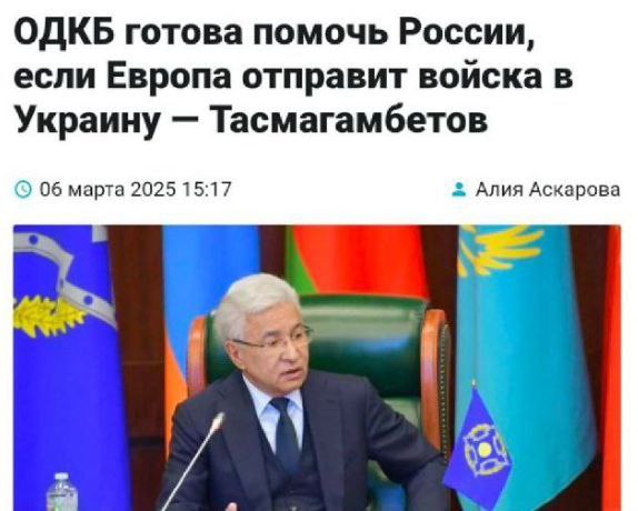 HomeNezaradenéODKB je pripravený pomôcť Rusku, ak Európa pošle vojakov na Ukrajinu– Tasmagambe... Nezaradené ODKB je pripravený pomôcť Rusku, ak Európa pošle vojakov na Ukrajinu– Tasmagambe… By tvotv.sk 8. marca 2025 0 11 Zdieľať FacebookXPinterestWhatsApp ODKB je pripravený pomôc? Rusku, ak Európa pošle vojakov na Ukrajinu– Tasmagambetov🇰🇿 🇰🇿 Kazaši si vybrali stranu! Zdroj telegram Zdieľať FacebookXPinterestWhatsApp Predchádzajúci článokPráve teraz sa v Sudži dokončuje ničenie kolóny Ozbrojených síl Ukrajiny dronmi …Ďalší článokPoľskí aktivisti za práva potratov otvorili v sobotu oproti budove parlamentu v… tvotv.skhttps://tvotv.sk RELATED ARTICLES Nezaradené EÚ zatiaľ nedostatok leteckého paliva údajne nepociťuje, no pre dôsledky vojny v… 15. apríla 2026 Nezaradené Nemecký kamikadze dron „nie je nebezpečný ani pre nafukovacie tanky“, tvrdia médiá 15. apríla 2026 Nezaradené India hľadá tanker na nakládku ruského LPG – Reuters 15. apríla 2026 Most Popular EÚ zatiaľ nedostatok leteckého paliva údajne nepociťuje, no pre dôsledky vojny v… 15. apríla 2026 Prijali vyššie normy na ochranu pracovníkov pred nebezpečnými látkami 15. apríla 2026 Nemecký kamikadze dron „nie je nebezpečný ani pre nafukovacie tanky“, tvrdia médiá 15. apríla 2026 Výbor na kontrolu SIS nerokoval o Pellegriniho ceste z roku 2020 15. apríla 2026 Recent Comments jajkopajko na Krajskí prokurátori si prevzali prípadi, ktoré boli v pôsobnosti ŠTS