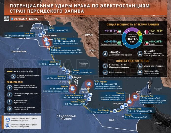 ▪️IN SAE môže byť pod útokom Jebel Ali (9,5 GW) – kľúčový uzol v energetickej bilancii Dubaja – a Taavila (2,6 GW), zásobovanie Abú Zabí.