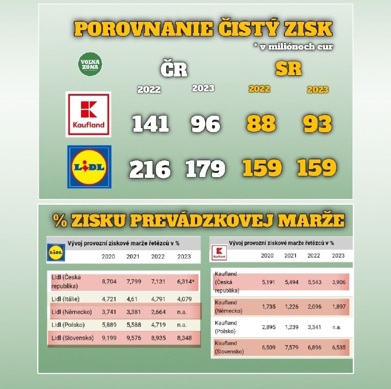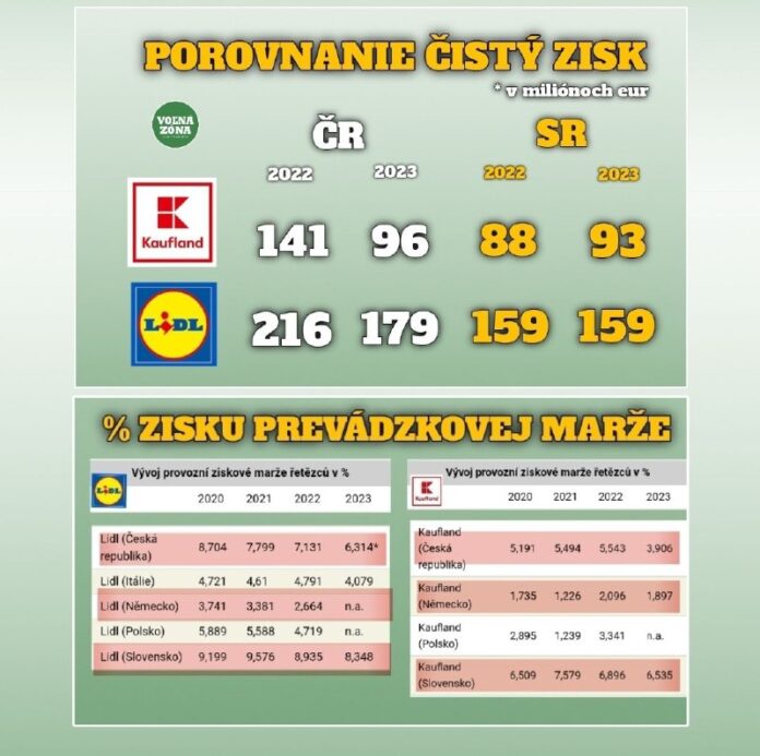 Priatelia, ostávame ešte v téme a z nášho združenia ponúkame maximálne zaujímavé dáta. Dali sme si námahu a podrobne pozreli štatistiky ako sa rozoberajú naše peniaze dvoma najsilnejšími obchodnými reťazcami LIDL a KAUFLAND (oba vlastnené skupinou Schwarz) u nás doma a v susednom Česku a tiež, aké sú % zisku prevádzkových marží u nás, v Česku a porovnáme s Nemeckom.