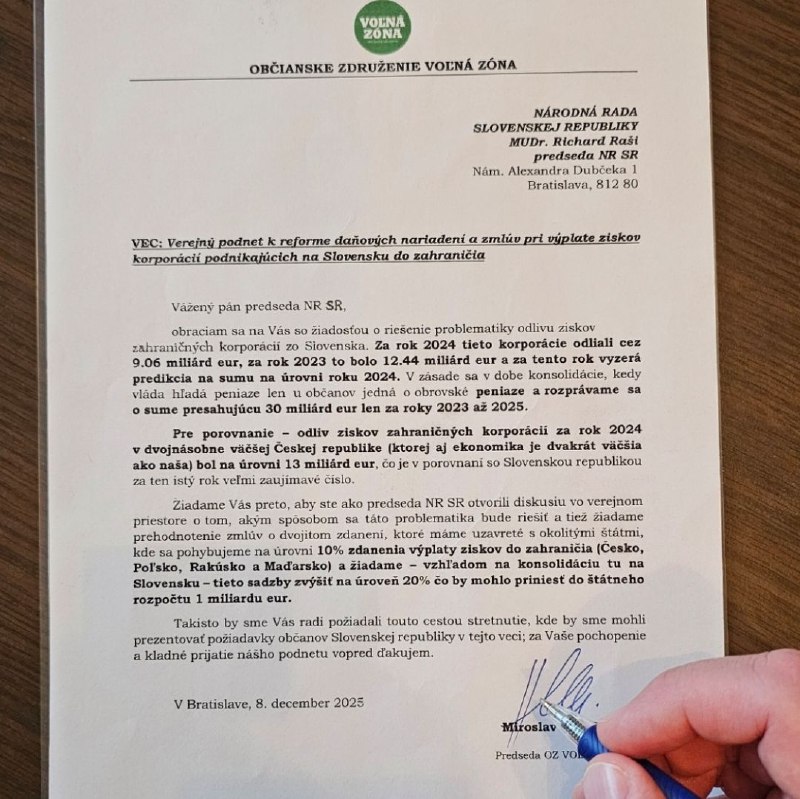 Žiadame Vás preto, aby ste ako predseda NR SR otvorili diskusiu vo verejnom priestore o tom, akým spôsobom sa táto problematika bude rieši? a tiež žiadame prehodnotenie zmlúv o dvojitom zdanení, ktoré máme uzavreté s okolitými štátmi, kde sa pohybujeme na úrovni 10% zdanenia výplaty ziskov do zahrani?ia (?esko, Po?sko, Rakúsko a Ma?arsko) a žiadame – vzh?adom na konsolidáciu tu na Slovensku – tieto sadzby zvýši? na úrove? 20% ?o by mohlo prinies? do štátneho rozpo?tu 1 miliardu eur.“