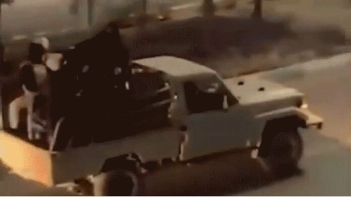 Na videu je počuť hrkotanie veľkokalibrových zbraní, keď vozidlá manévrujú mestskými ulicami.