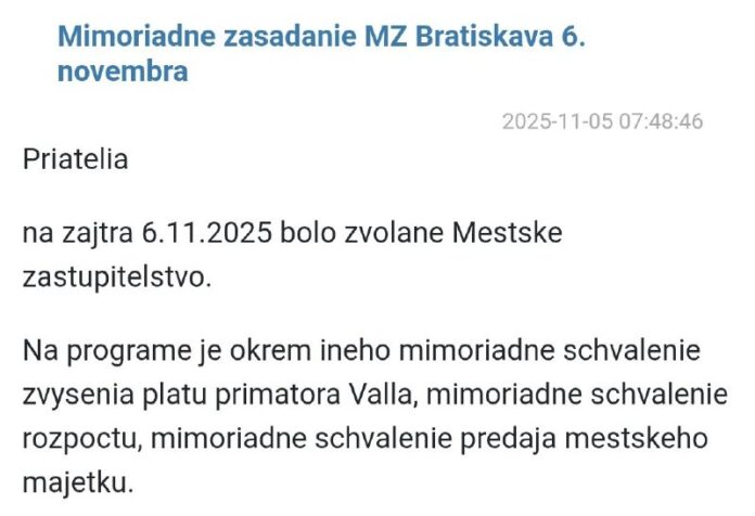 Pripomínam, že v roku 2022 som kandidoval na primátora Bratislavy a skon?il som tretí za Kusým a ví?azom Vallom; v mene ob?anov sa preto budem o tieto aktuálne veci zaujíma? a rieši? ich.