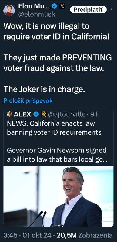 Guvernér Gavin Newsom (Bidenov ,,demokrat“) podpísal zákon, ktorý bráni miestnym samosprávam prijíma? zákony, ktoré od obyvate?ov vyžadujú, aby pri hlasovaní sa preukázali platným preukazom totožnosti.
